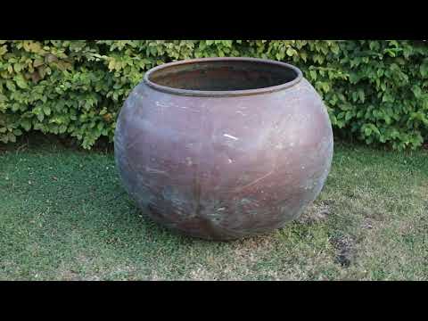 This pot is in top condtion. A lovely globe shape and large proportions. This will be wonderful planted up and the depth of planting is really good for some decent sized plants. A copper pot, heavy and previously used in the chocolate industry in this country.