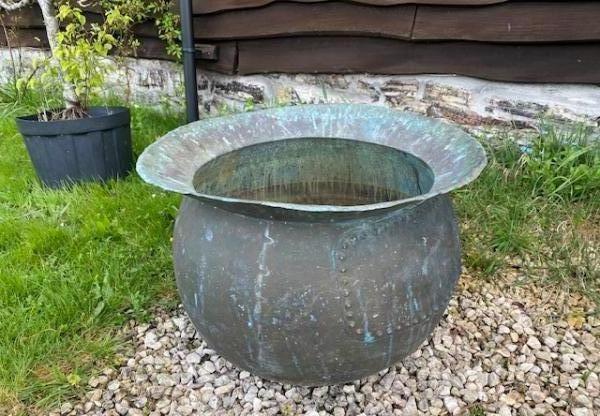Copper garden antiques look great all year round in the garden with many having wonderful verdigris colours. We have a wide selection of copper pots at the moment. English copper coppers, previously household objects for holding water and pots used in the making of sweets/chocolate or cheese.