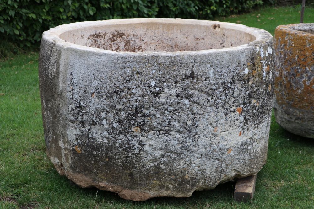 This is a beautifully coloured, larger than usual round limestone trough from France. An absolute stunner. Has a bit of a nibbled base, would make a wonderful planted trough.